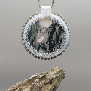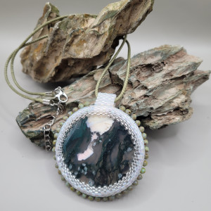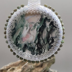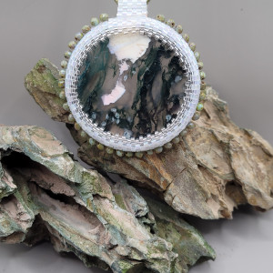 Kaboszon został ręcznie opleciony szklanymi koralikami w odcieniu perłowej bieli, tworząc elegancką i trwałą oprawę. Całość otacza koronkowy wianek z drobnych, opalizujących koralików z efektem picasso, które nadają lekko rustykalny, organiczny charakter.