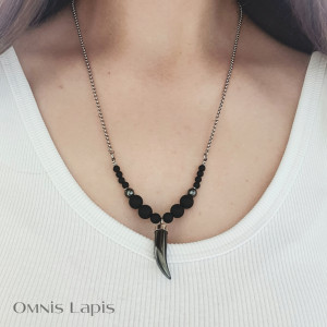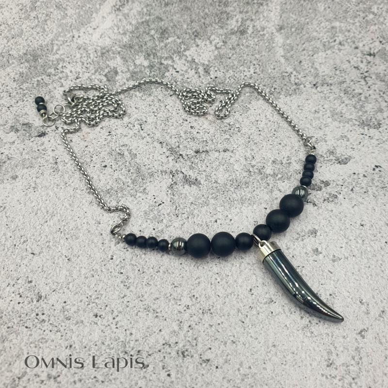 Oryginalny naszyjnik w odcieniach stalowej szarości i matowej czerni. Energetyczny, wyrazisty, niezwykle dekoracyjny. Ozdobiony dużą zawieszką z błyszczącego hematytu w kształcie grotu oraz kulami onyksu i turmalinu.