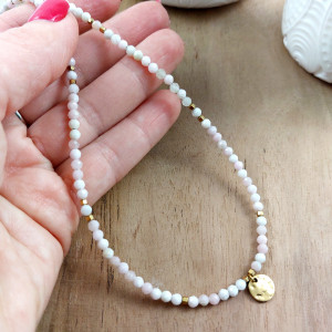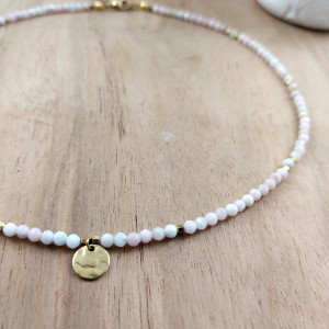 Naszyjnik jest wykonany z kamieni półszlachetnych (opal), przekładki są z hematytów natomiast elemanty metalowe to stal chirurgiczna.