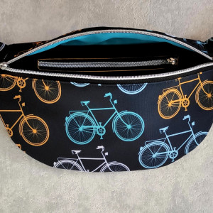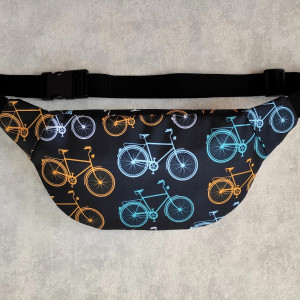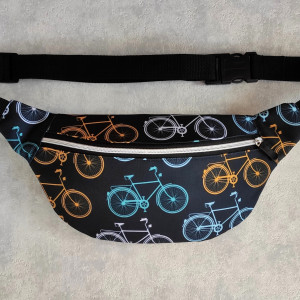 Nerka w kolorowe rowery na czarnym tle. Można ją nosić na tali lub na skos przez ramię. Jest bardzo pojemna i pakowna, mieści wszystko to co niezbędne np. na spacerze, jak portfel, telefon i chusteczki. Przez to, że nie jest "odstająca" od ciała to w zimę można ją nosić także pod kurtką. W środku ma dodatkową, zamykaną na suwak kieszonkę, idealną na bilety, dokumenty czy karty płatnicze. Zarówno zewnętrzna tkanina, podszewka (tu czarna i niebieska), jak i kieszonka (tu żółta), są wodoodporne, dla jak największej ochrony noszonych tam przedmiotów. Wymiary (plus/minus 1-2cm):