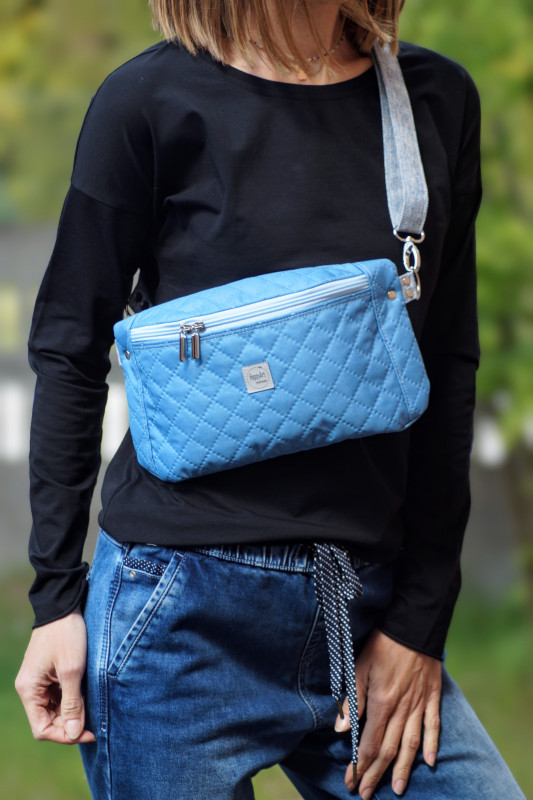 Kompaktowa, płaska saszetka-nerka do noszenia na biodrach lub na ukos, uszyta z jasnoniebieskiej pikowanej wodoodpornej tkaniny.