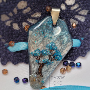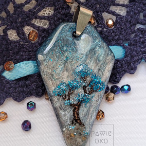 Całość - od modelowania z cienkich drucików pnia i gałęzi, przez malowanie tła i tworzenie ziemi, nadanie kształtu koronie drzewa, aż po wylanie ostatniej warstwy żywicy - wykonane ręcznie. Dzieki zastosowanej technice drzewo sprawia wrażenie przestrzennego - ta biżuteria jest jak własny mały kawałek wszechświata noszony na szyi. Jedyny taki, unikatowy egzemplarz.