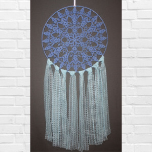Wykonany ręcznie z akrylowej nici. Jako zawieszka służy satynowa wstążeczka. Całość rozpięta jest na metalowej obręczy o średnicy 40 cm. Długość koronkowych "frędzli" to około 60 cm.