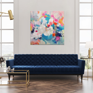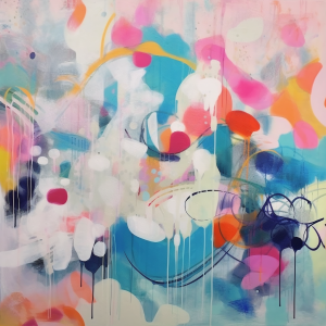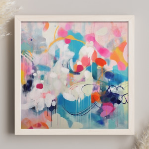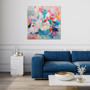 Ekspresyjny obraz abstrakcyjny w odcieniach błękitu, różu i pomarańczowego i bieli. Ta kolorowa, ekspresyjna abstrakcja doskonale dopełni nowoczesne wnętrza.