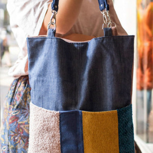 Z przodu dwie kieszenie w stylu patchwork. Całość zapinana na zapięcie magnetyczne.