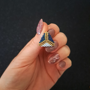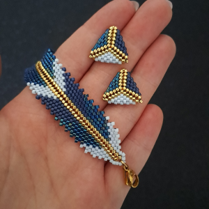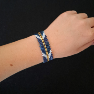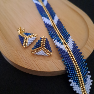 Bransoletka o szerokości 1,8 cm ma klasyczny, geometryczny wzór, w którym przeplatają się trzy odcienie niebieskiego ze złotymi akcentami, nadając jej luksusowego charakteru. Starannie wykonana, pasuje zarówno do wieczorowych sukni, jak i do eleganckich stylizacji biurowych. To biżuteria, która dodaje szyku i wyróżnia się na tle innych dodatków, przyciągając spojrzenia swoją wyjątkową harmonią i blaskiem.