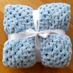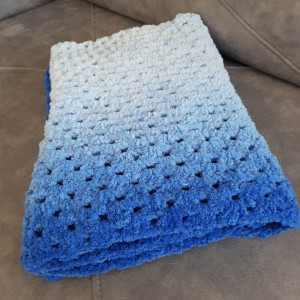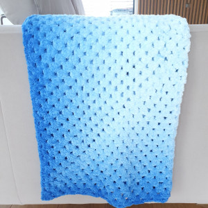 Nieprawdopodobnie miękki i przytulaśny kocyk wykonany na szydełku z włóczki Alize Softy Plus. Kolory pięknie przechodzą od jasnego błękitu do niebieskiego. Świetnie pasuje jako kocyk do wózka, narzutka do łóżeczka, element wystroju wnętrza, rekwizyt do sesji zdjęciowych. Kocyk sprawdzi się dla wrażliwych dzieci i skłonnych do alergii, nie zawiera wełny i jest bardzo delikatny w dotyku. Sprawdzi się również po kapieli.