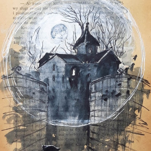 "Nokturn" akwarela na kartce ze starej książki