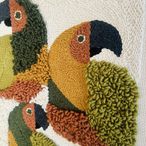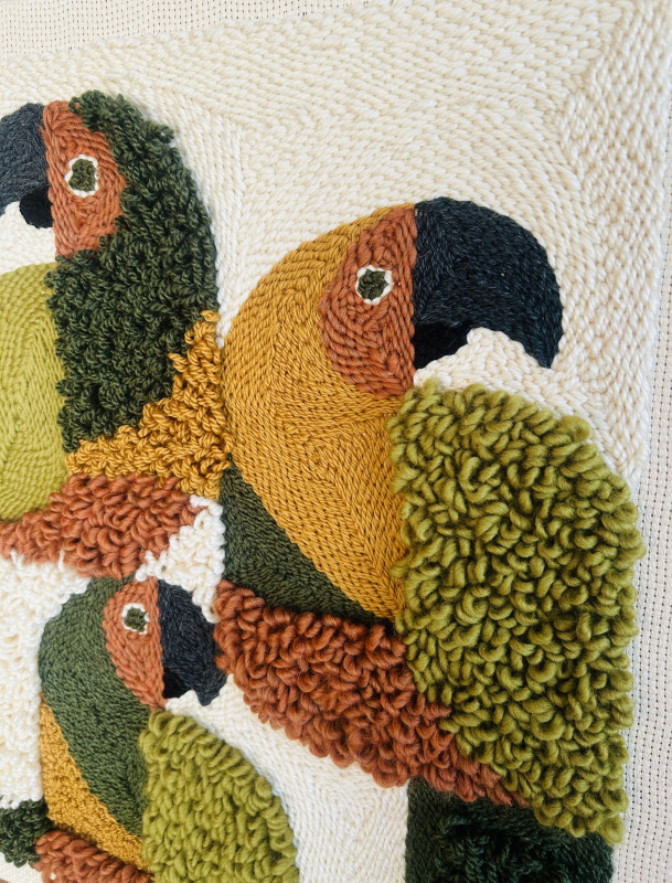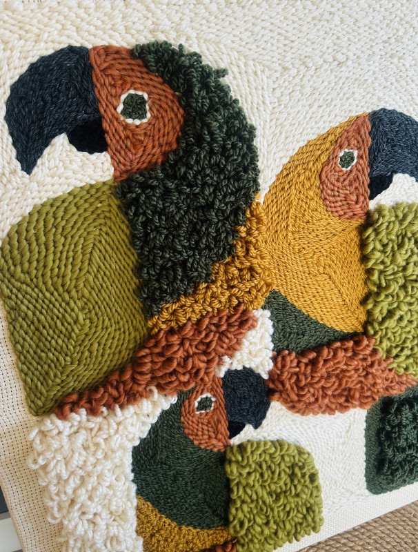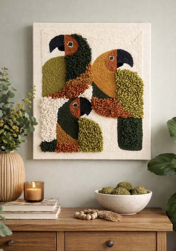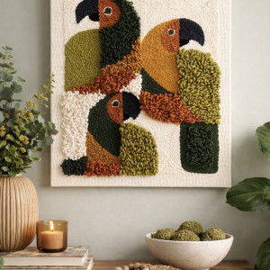 Unikatowy, ręcznie tkany obraz o wyraźnej, przestrzennej fakturze. Zróżnicowane kierunki tkania tworzą subtelny efekt 3D, dzięki któremu praca pięknie reaguje na światło i przyciąga wzrok z bliska. Naturalna paleta kolorów: zieleni, musztardy, ceglastego brązu i ecru sprawia, że obraz doskonale wpisuje się we wnętrza w stylu boho, organicznym i nowoczesnym. To dekoracja, która dodaje wnętrzu ciepła, głębi i artystycznego charakteru. • wymiary: 50 × 60 cm • technika: ręczne tkactwo • faktura: wyraźny efekt 3D • unikatowy egzemplarz