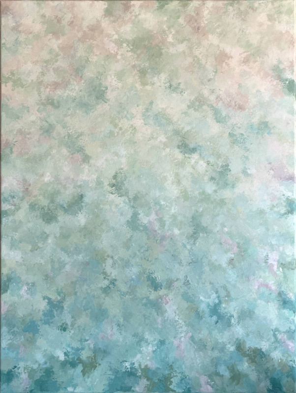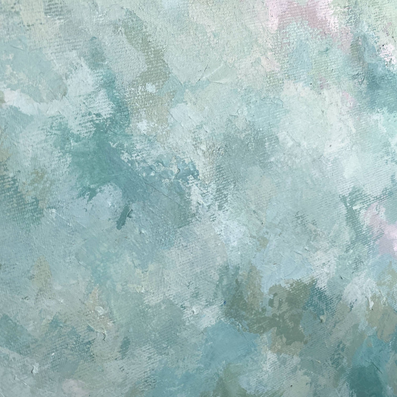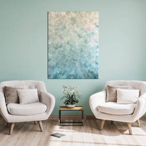 Oryginalny, ręcznie malowany nowoczesny obraz akrylowy. Obraz został namalowany głownie szpachelką, dzięki czemu ma widoczną fakturę. Obraz jest namalowany przy użyciu bardzo delkiatnych, pastelowych odcieni zieleni, seledynu, beżu i bieli. Idealnie wpasuje się w naturalne wnętrza oraz styl boho.