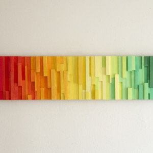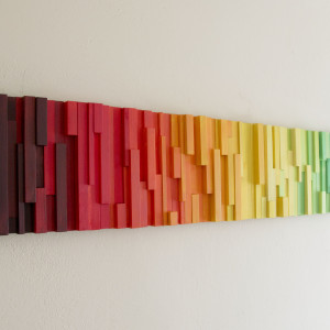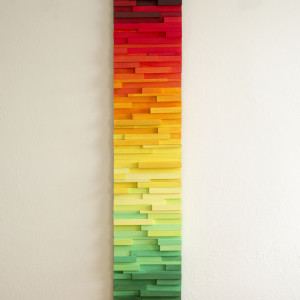 Mozaika wykonana z drewna sosnowego. Każdy element zostałręcznie wycięty, wyszlifowany i pomalowany.