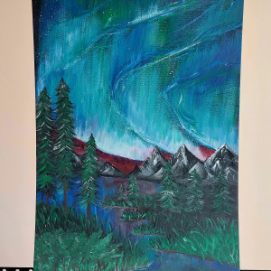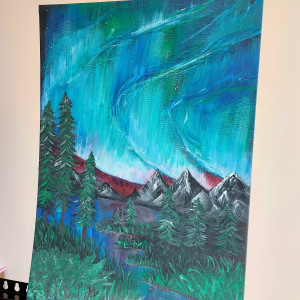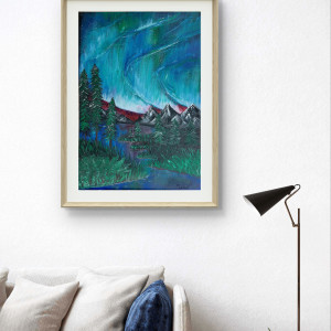 Obraz ma wymiary 30x40, jest namalowany farbami akrylowymi na płótnie ( podobrazie)Przedstawiam mój najnowszy Obraz " Magiczna Zorza". Namalowałam piękną, wielobarwną Zorzę Polarną nad górami.