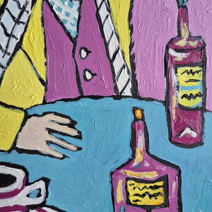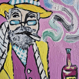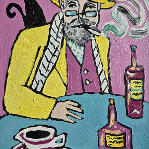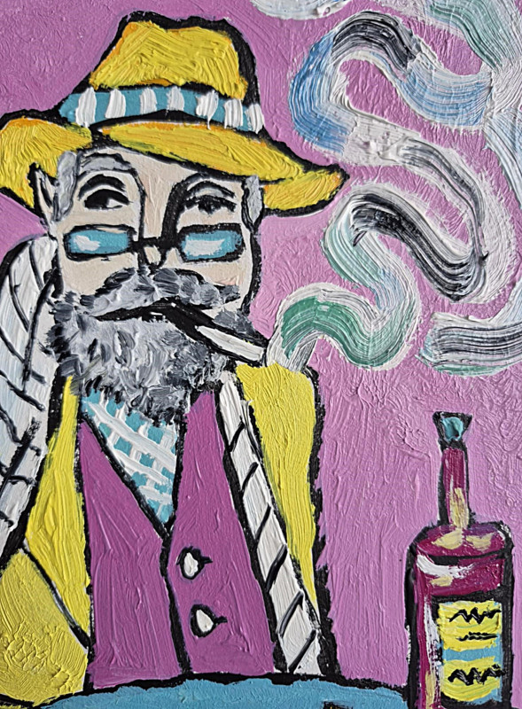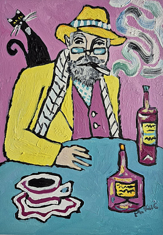 Obraz namalowany olejami na płycie 21/29 cm, sygnowany z przodu. Jest to moja autorska kompozycja. Świetnie może być eksponowany w nowoczesnych wnętrzach o stonowanej kolorystyce. Swoimi barwami może rozjaśnić takie wnętrza, w oświetleniu dziennym, jak i sztucznym. Idealny na prezent Obraz pulsuje intensywnymi kolorami i lekko ironiczną atmosferą. Na pierwszym planie siedzi mężczyzna o siwej brodzie i przenikliwym spojrzeniu, ubrany w żółty płaszcz i kapelusz, jakby wyjęty z innej epoki lub snu. Jego twarz, częściowo skryta za okularami, emanuje spokojem, ale i tajemnicą – to ktoś, kto dużo widział i jeszcze więcej przemilczał. Papieros w ustach wypuszcza miękkie, falujące smugi dymu, które unoszą się w różowej przestrzeni tła niczym myśli oderwane od rzeczywistości. Za jego ramieniem czai się czarny kot – symbol niezależności, magii lub cichego towarzysza nocnych rozmyślań. Jego żółte oczy kontrastują z resztą kompozycji, dodając scenie nuty niepokoju i czujności. Na stole, w chłodnym odcieniu błękitu, stoją butelki z tajemniczymi etykietami oraz filiżanka kawy na falującym spodku. Przedmioty codzienne, a jednak przedstawione w sposób niemal rytualny – jak rekwizyty w osobistym teatrze bohatera. Świeca i alkohol sugerują noc, ciszę, może samotność, może twórcze skupienie.
