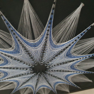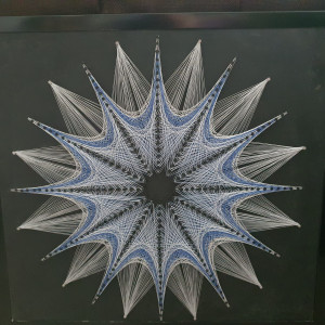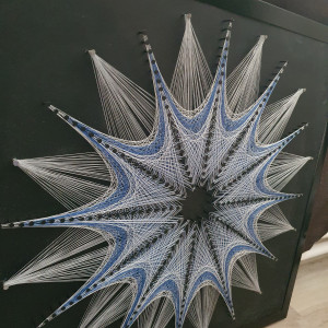 Przedmiotem sprzedaży jest ręcznie wykonany obraz z nici, na solidnej płycie, metodą string-art. Płyta 2cm, wymiary 44 szerokość x 44 wysokość. Kolory: biały, szary, niebieski, płyta czarna matowa.