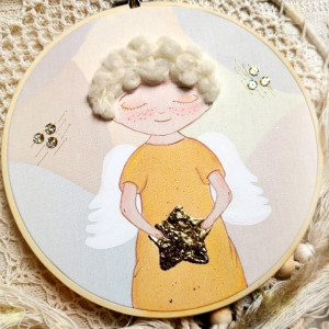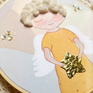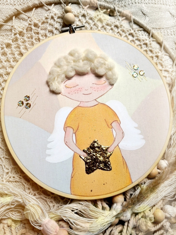 - Efekt 3D tworzą włoski aniołka. Gwiazdki dzięki zastosowaniu preparatu do złoceń pięknie mienią się w świetle dziennym.