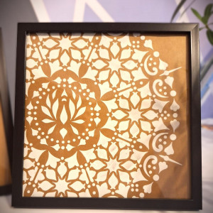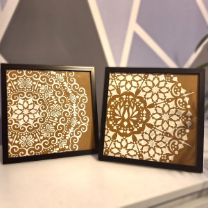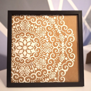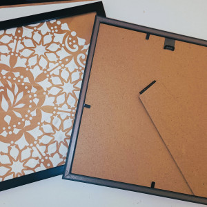 Obrazki ręcznie malowane, białą pastą strukturalną na sztywnym kartonie. Umieszczone w ramkach za szkłem.