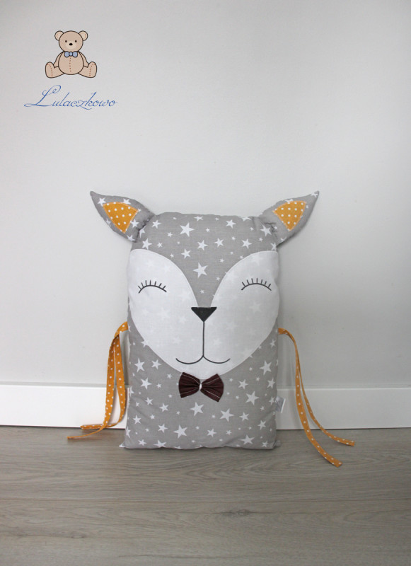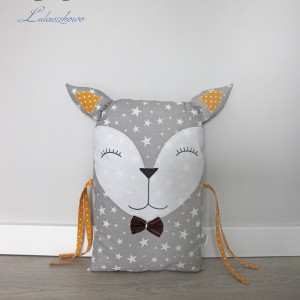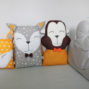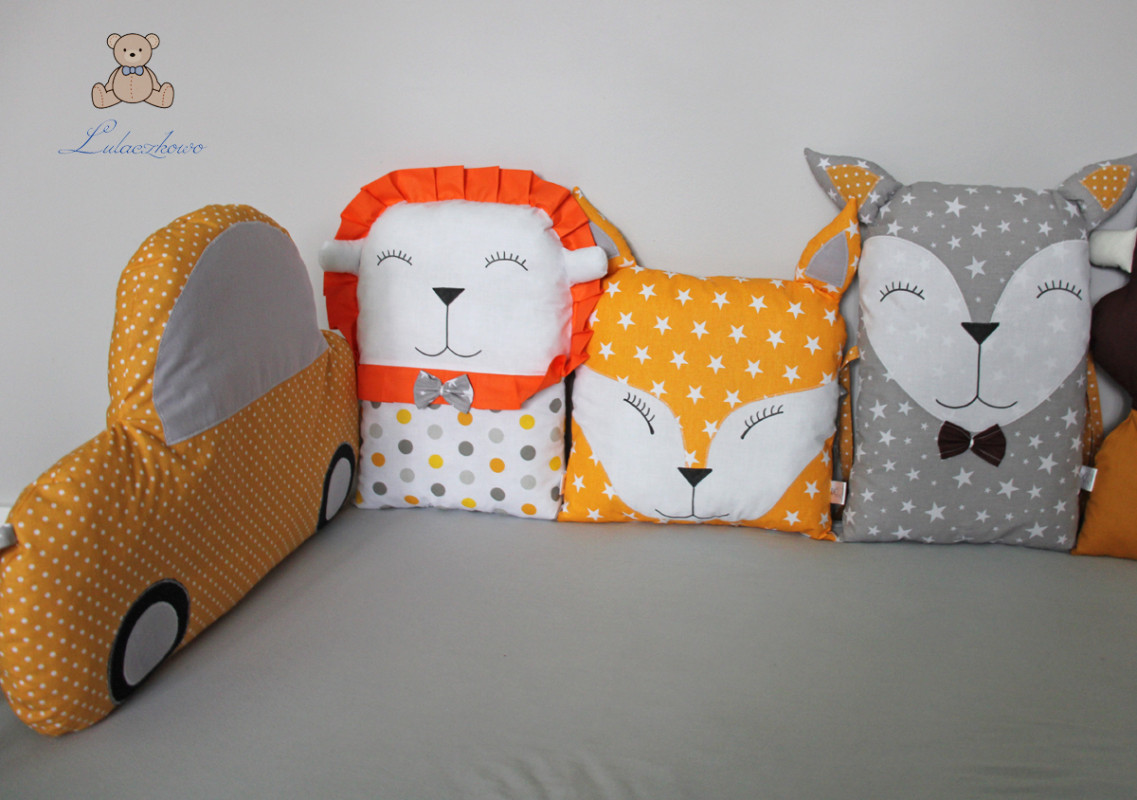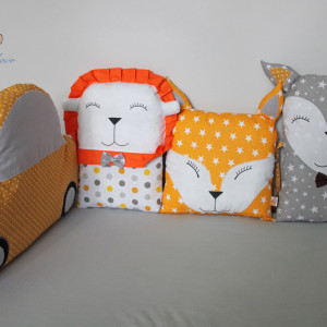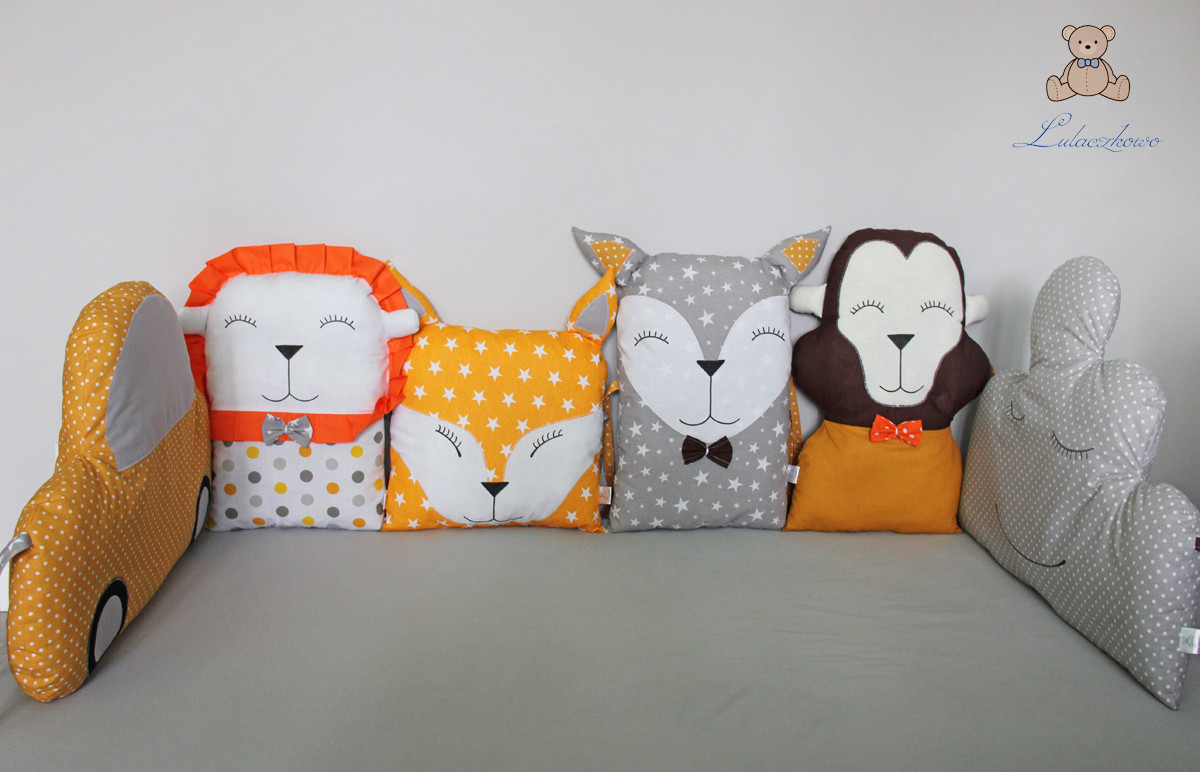 Ochraniacz modułowy do łóżeczka dziecięcego składający się z 6 podusi (4 zwierzątka + chmurka i autko/domek). Każda podusia uszyta jest z 100% bawełny i wypełniona antyalergiczną kulką silikonową, oczka i noski malowane wodoodpornym markerem do tkanin. Po bokach każdej podusi znajdują się troczki umożliwiające przymocowanie jej do szczebelków łóżeczka.