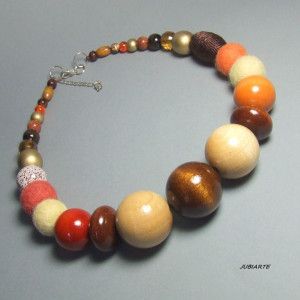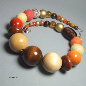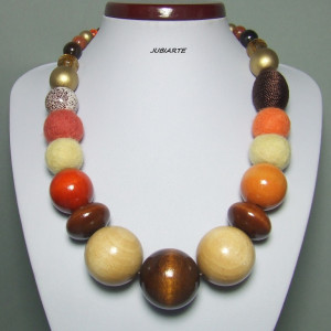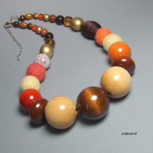 Lekko stopniowany naszyjnik wykonany z korali: filcowych, kul i owali drewnianych, ceramiki, kul piasku pustyni, koralików oplatanych, crackle, gładkich oraz szlifowanych kul z akrylu oraz elementów posrebrzanych (zapięcie - karabińczyk i przedłużka). Całość na mocnym woskowanym sznurku bawełnianym.
