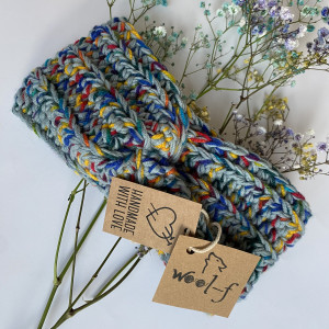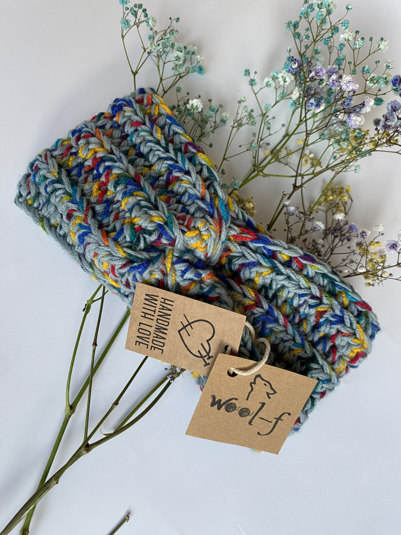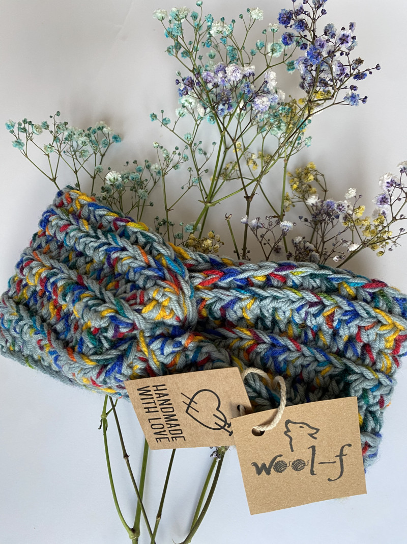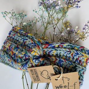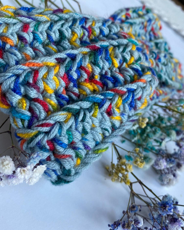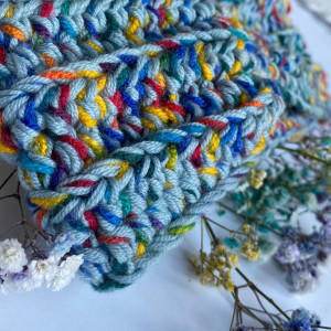 Połączenie wielobarwnej włóczki z kolorem szałwiowym.