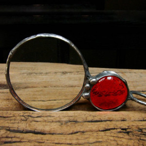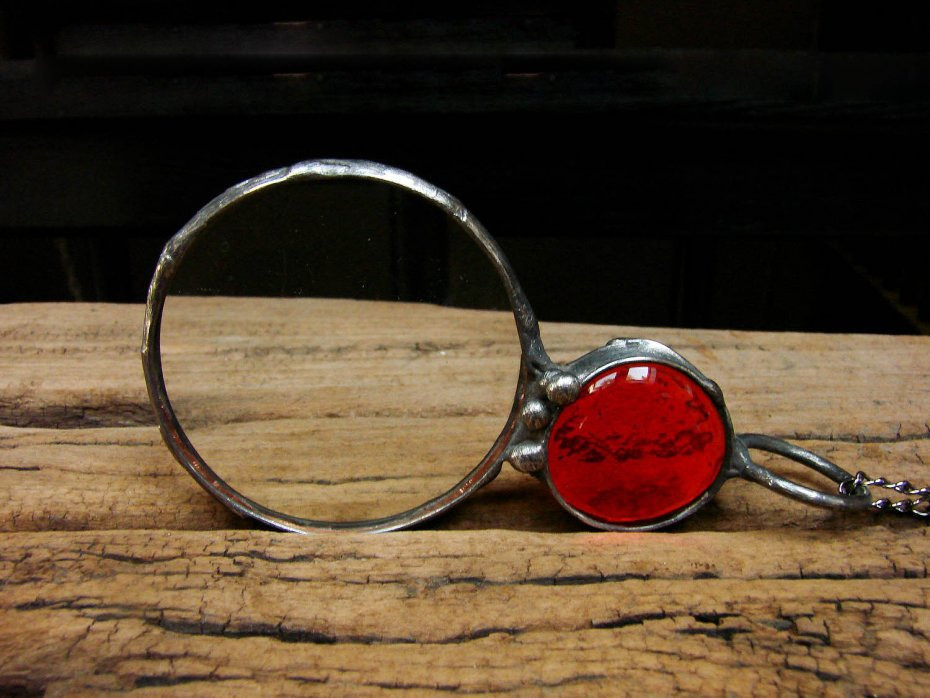 Lupa ma średnicę 6 cm inkrustowana szklanym kaboszonem w pięknym pomarańczowym kolorze oprawiona w miedź lutowaną stopem cyny i srebra. Długość lupy to ok. 12.5 cm. Całość patynowana na kolor starego srebra ręcznie przecierana i polerowana , zawieszona na 60 cm łańcuszku. Jeśli życzą sobie Państwo inną dowolną długość łańcuszka proszę o informacje mailową po zakupie a bez problemu to zmienię. Zapraszam do zakupu