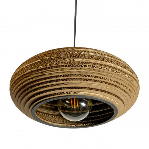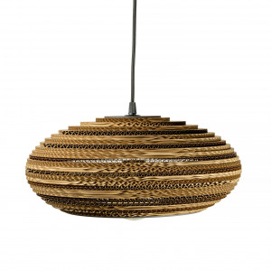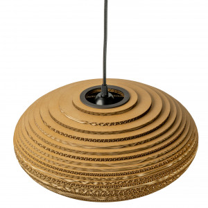 Ekologiczna lampa wykonana z tektury falistej i sklejki brzozowej. Lampa wycięta laserem, sklejana ręcznie klejem nie emitującym szkodliwych substancji oraz zaimpregnowana lakierem akrylowym. Fragmenty lampy wykończone ringami ze sklejki liściastej dodającymi elegancji i zabezpieczającymi przed uszkodzeniami. Lampa wyposażona w kabel z oplotem o długości 1,2 m i czarne oprawki przystosowane do żarówek energooszczędnych E27. Ze względu na ręczne wykonanie każda lampa to produkt unikatowy i może się nieco różnić od egzemplarza przedstawionego na zdjęciach.