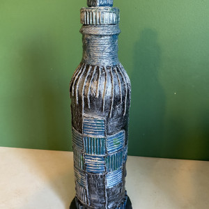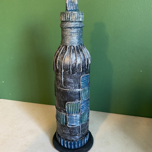 Plasykowa butelka, ozdobiona techniką powertexu.
