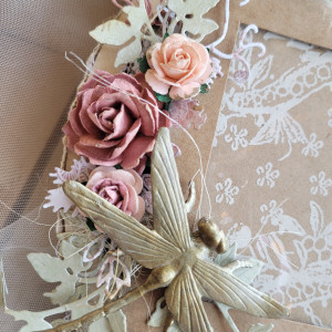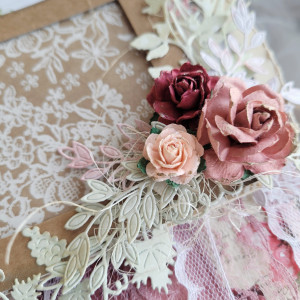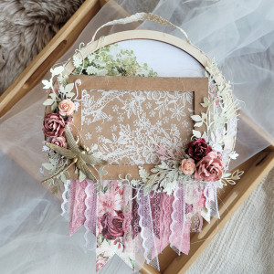 Ramka została osadzona na sztywnej obręczy, co nadaje jej oryginalny, rustykalny charakter. Wykorzystanie papieru kraftowego, koronki, subtelnych wycinanych listków oraz ręcznie wykonanych papierowych kwiatów w odcieniach bordo, różu i beżu sprawia, że całość prezentuje się niezwykle delikatnie i harmonijnie. Dół ramki zdobią zwisające koronkowe i tiulowe wstążki w odcieniach różu, beżu i bieli, przeplatane kwiatowymi wzorami, która dodają jej lekkości i romantycznego stylu shabby chic.