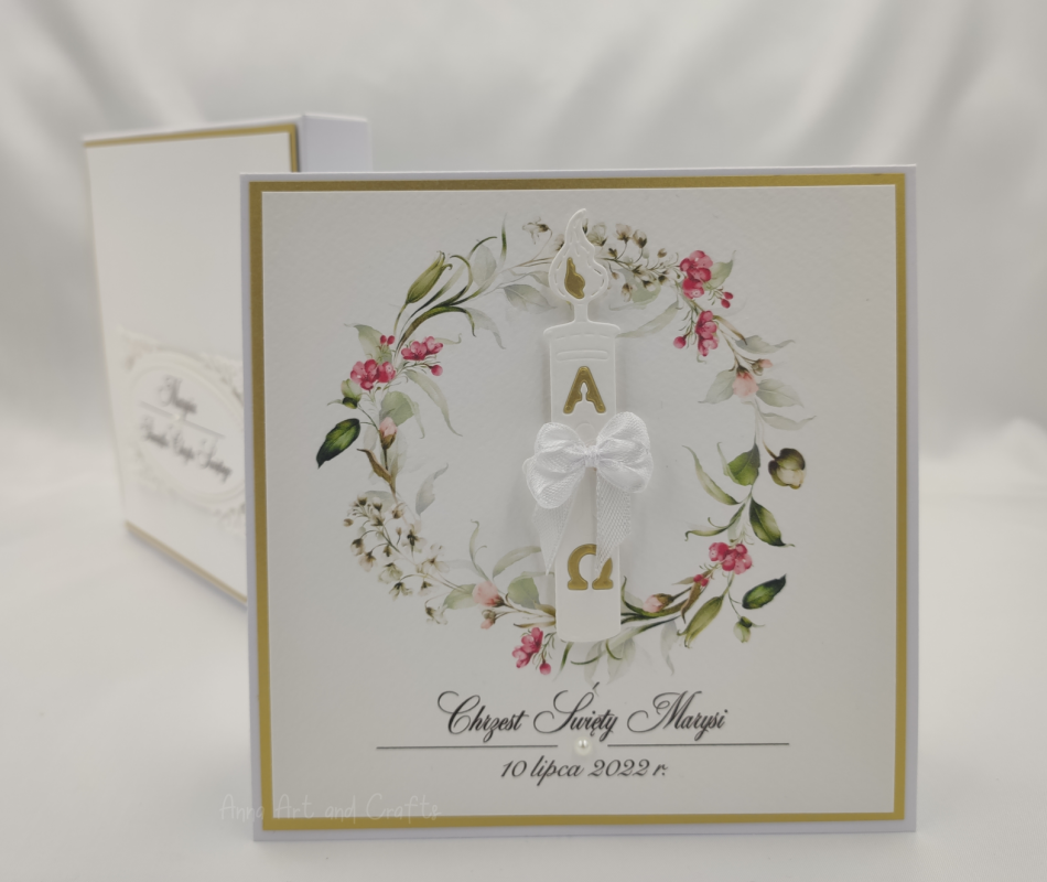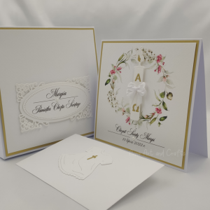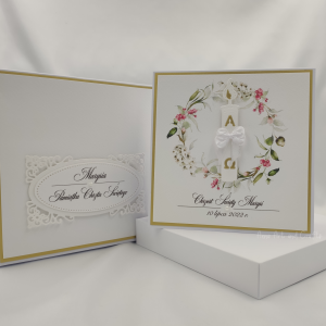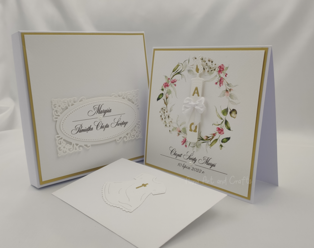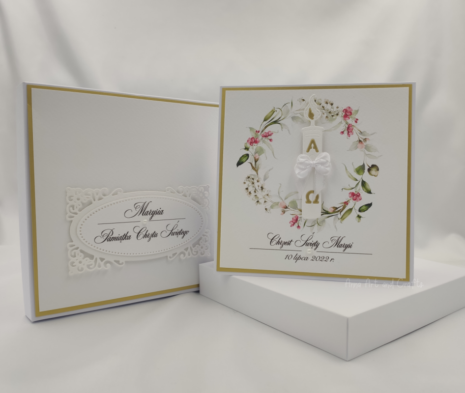 Elegancka, ręcznie wykonana pamiątka chrztu, kartka w pudełku z ozdobną kopertą. Delikatne i subtelne połączenie bieli i matowego złota. Idealna pamiątka z okazji chrztu dla dziewczynki.