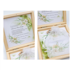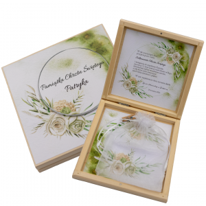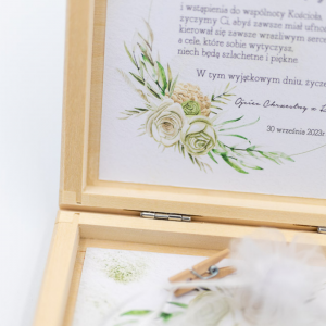W pudełeczku znajdują życzenia oraz miejsce na pieniądze z okazji Chrztu Świętego.
