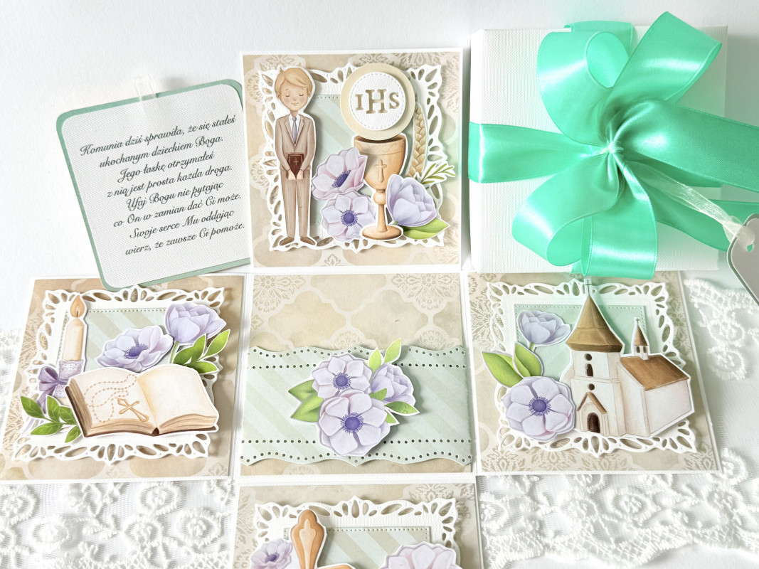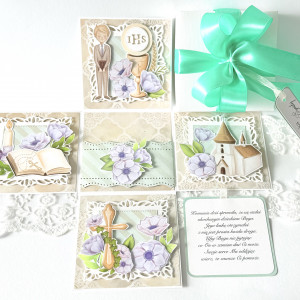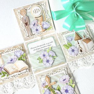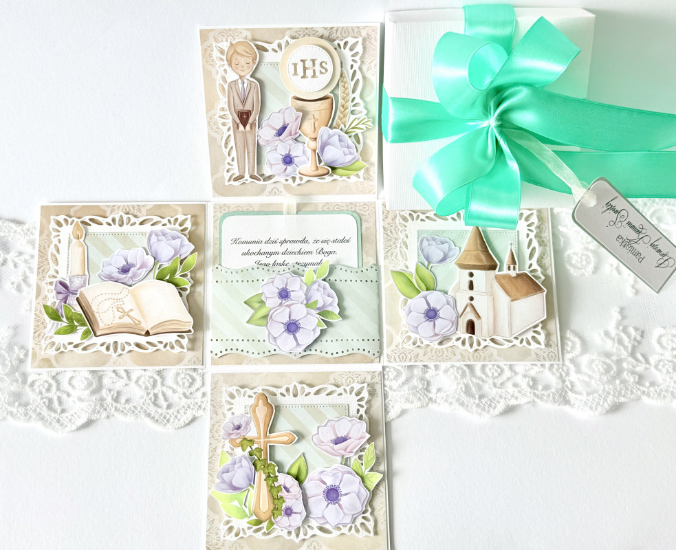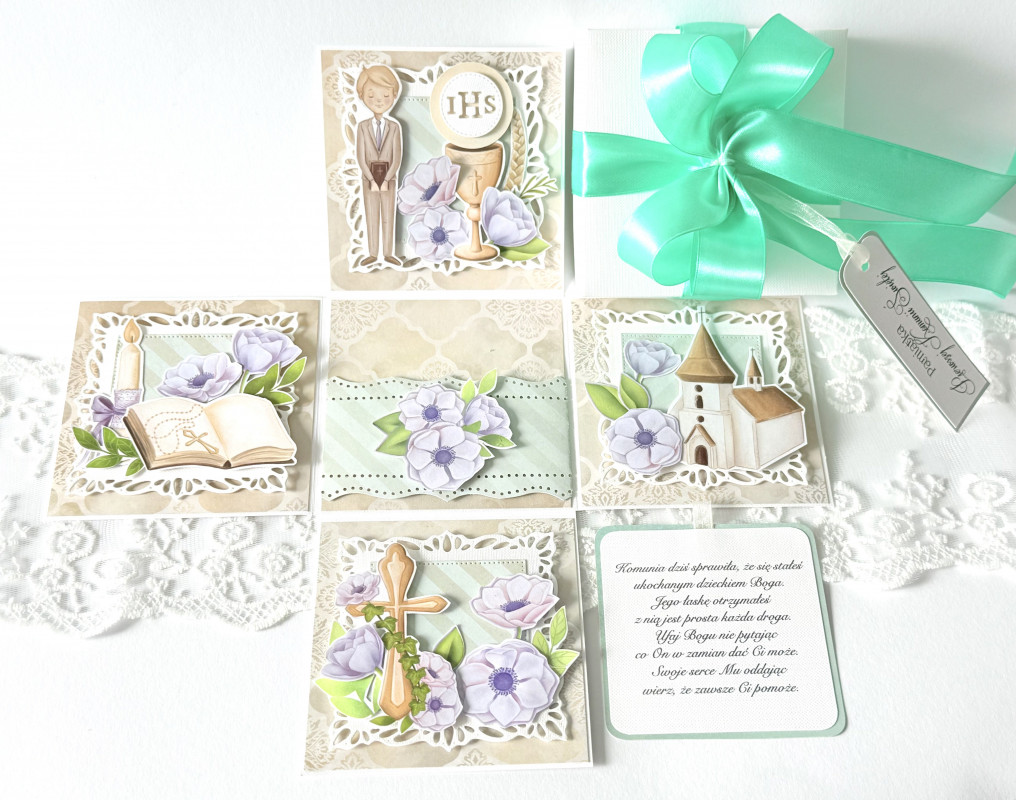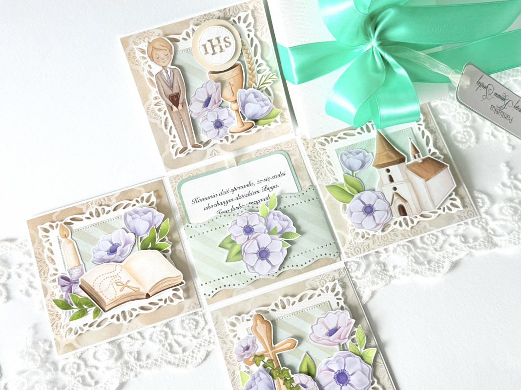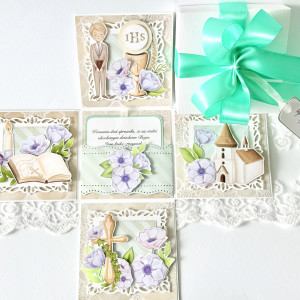 Komunijny exploding box jest idealnym "opakowaniem" prezentu w postaci gotówki na uroczystość Pierwszej Komunii Świętej. Po zdjęciu wieczka gwarantowany jest efekt "wow!"