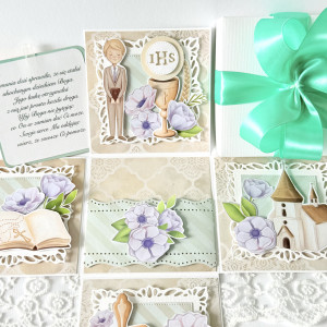 Pudełko na bocznych ścianka ma piękne obrazki związane z Pierwszą Komunią a w środkowej części znajduje się kieszonka na życzenia oraz ewentualny prezent w postaci "papierowej":)
