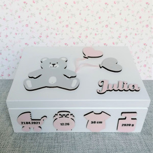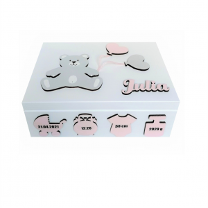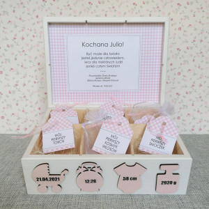 Pudełko w całości pomalowane zostało na biały kolor a jego ozdobą jest namalowany przez naszych plastyków miś z balonikami oraz imię dziecka. Środek pudełka został podzielony na 6 przegródek, w których znajduje się białe sianko i ozdobne karteczki z napisami: 1. mój pierwszy ząbek 2. mój pierwszy smoczek 3. mój pierwszy torcik 4. mój pierwszy kosmyk włosów 5. mój pierwszy kroczek 6. moi pierwsi goście