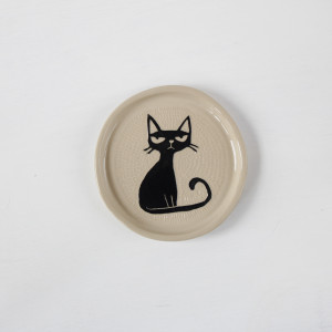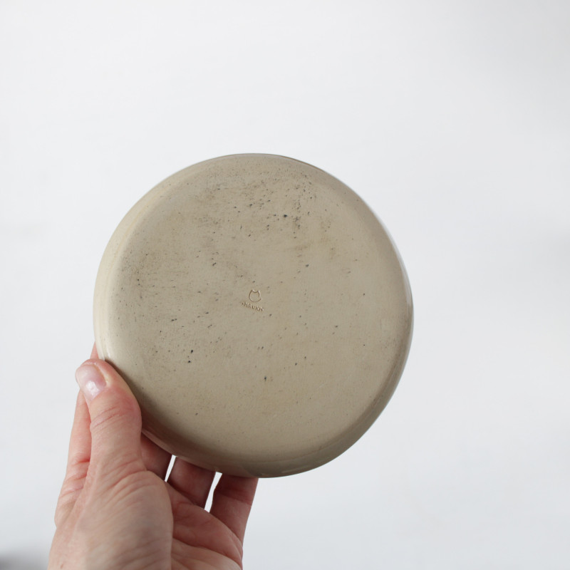 Talerzyk został wykonany ręcznie z jasnej masy ceramicznej. Wzór widoczny na naczyniu powstał techniką sgraffito.