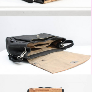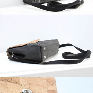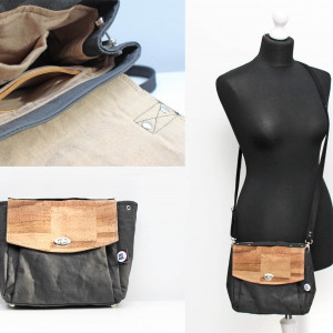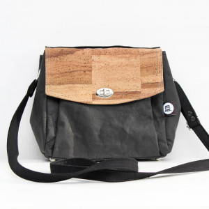 Niewielka torebka wykonana z washpapa aged w kolorze czernym. Klapka wykonana jest z tkaniny pokrytej naturalnym korekiem i zapinana jest za pomocą zapięcia obrotowego. Podszewka to tkanina bawełnianej w kolorze naturalnego brązu. Posiada jedną kieszonkę na przodzie (ta pod klapką) oraz dwie kieszonki w środku - jedna zapinana na zamek, druga otwarta. Boki spięte metalową sztangą do której przyczepione zostały karabińczyki paska - możliwość noszenia na 3 sposoby. Można rozkręcić sztangę i wywinąć boki torebki na zewnątrz. Pasek regulowany, wykonany z tkaniny bawełnianej. Wymiary korpusu to ok: 31/28x23x8 cm