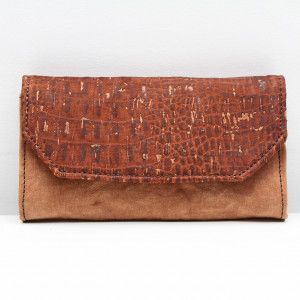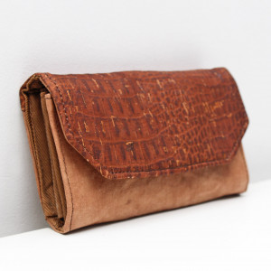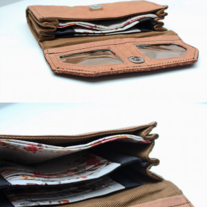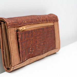 Portfel powstał z połączenia wshpapy aged w kolorze brązowym, oraz tkaniny pokrytej korkiem naturalnym. Podszewa to połaczenie różnych tkanin bawełnianych. Całość zapinana na zatrzask magnetyczny. Posiada jedną kieszeń zapinaną zamkiem błyskawicznym, 2 okienka z przeźroczystą folią na zdjęcia, kieszonki mieszczące 6 kart oraz masę innych, przydatnych zakamarków. Wymiary to ok: 17,5x10 cm