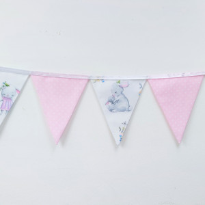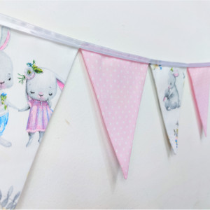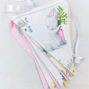 Girlanda ma długość ok. 200cm i składa się z 11 proporczyków (rozmieszczonych na długości ok.170cm) w pastelowych kolorach: delikatny róż i błękit (elementy w grochy) oraz pastelowy żółty (elementy gładkie), dopełnionych nadającymi charakteru białymi elementami w kwiatowy wzór ze słodkimi zajączkami :)