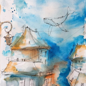 "Patrz w niebo" akwarela - pejzaż fantazyjny