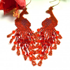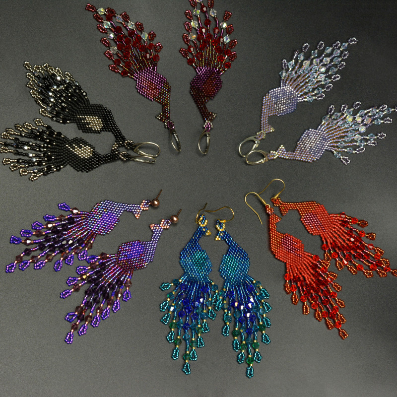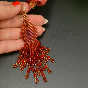 Wyplotłam je z najwyższej jakości japońskich koralików Toho i Miyuki w odcieniach czerwieni, dodatkowo we frędzle wplotłam fasetowane kryształki.