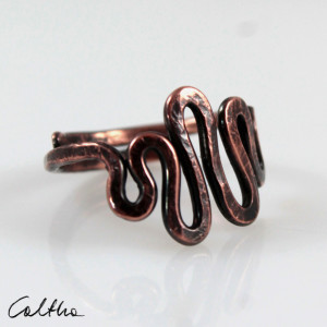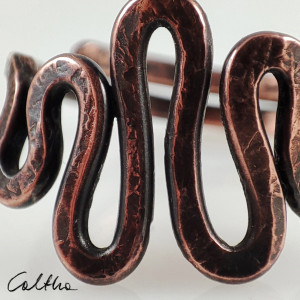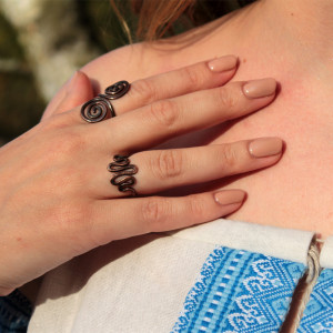 Pierścionek w całości wykonany z miedzi, faktura lekko podkreślona ciemną patyną uzyskaną w procesie oksydacji (bez użycia barwników).