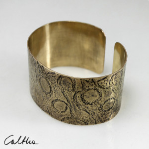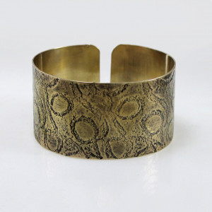Ciekawa mosiężna bransoleta w kolorze złota. Dzięki prostej formie może być noszona zarówno przez kobietę jak i mężczyznę. Odpowiednia na różne okazje, pasuje do swobodnych jak i eleganckich stylizacji. Doskonale nadaje się na prezent. Bransoletka została wykonana z mosięznej blachy, jej szerokość to ok 3,5 cm Wzór jest lekko podkreślony ciemną patyną uzyskaną w procesie oksydacji (bez użycia sztucznych barwników).