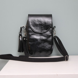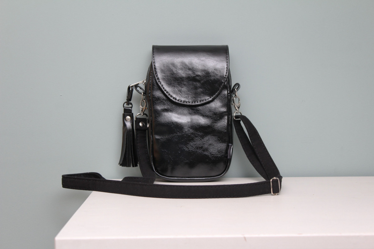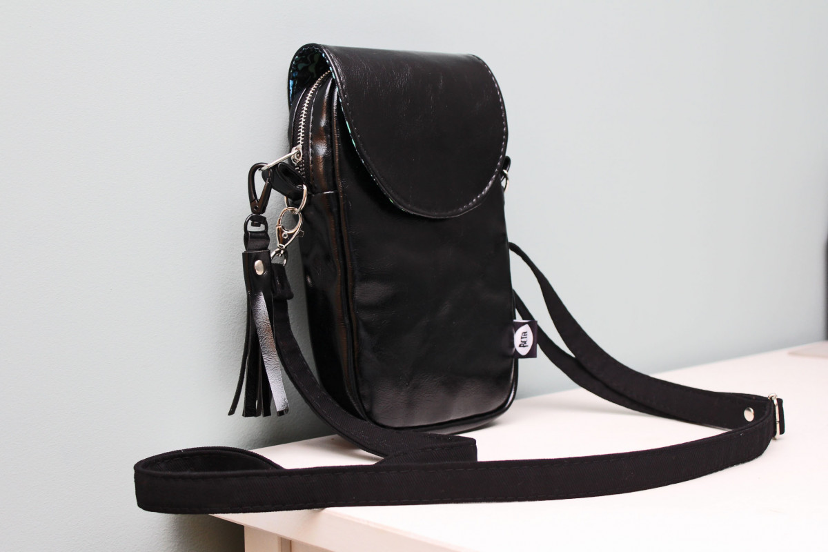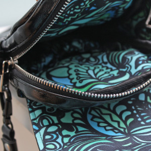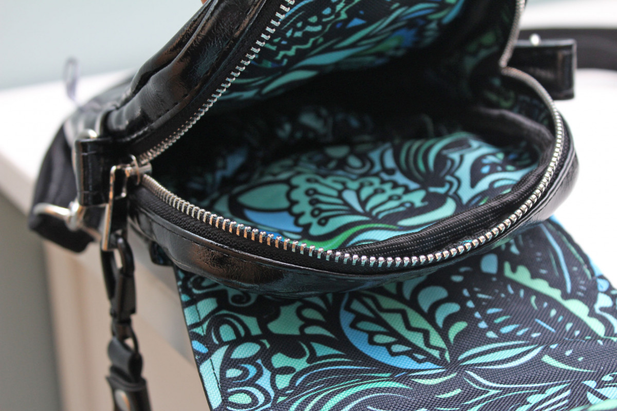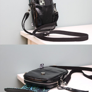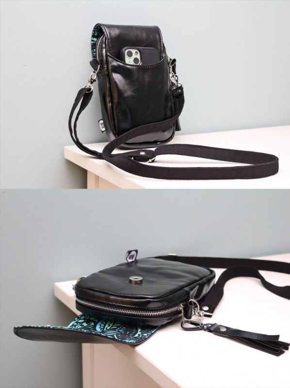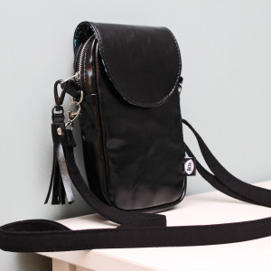 Kolorowa mini torebka typu box z klapką wykonana z połączenia czarnej, błyszczącej eko skóry. Całość zapinana na magnetyczne zapiecie w klapce oraz na zamek błyskawiczny. Z tyłu posiada otwartą kieszeń idealną na telefon. Podszewka to połączenie tkaniny wodoodpornej oraz tkaniny bawełnianej. w środku znajduje się kieszonka otwarta. Pasek bawełniany, odpinany z możliwością regulacji.