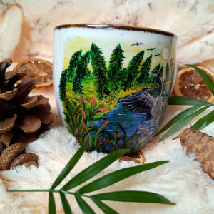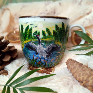 Duży kubek z żurawiem na tle przepięknego pejzażu zachęcającego do odpoczynku. Woda i natura o wschodzie lub zachodzie słońca, w miejscu nieodkrytym. Kubek malowany wiele godzin z wielką troską o wszelkie szczegóły z miłości do natury, z miłości do tego co piękne..
