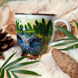 Piękny ręcznie malowany kubek Żuraw z pejzażem wodą 480ml.