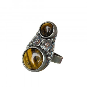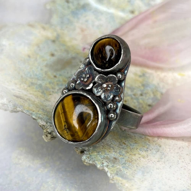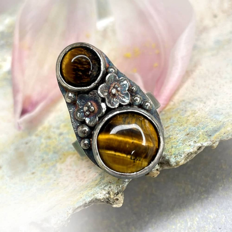 Srebrny pierścionek wykonany ręcznie w pracowni Artseko to wyjątkowe połączenie srebra z tygrysim okiem. Charakterystyczny blask kamieni w połączeniu z roślinnym wzorem tworzy wyjątkową, romantyczną biżuterię z nutą tajemniczości. Srebro zostało poddane procesowi oksydowania, dzięki czemu kwiatowy wzór nabrał głębi oraz elegancji. Ten pierścionek będzie doskonałą propozycją dla kobiet, które cenią sobie ręcznie wykonane dodatki oraz niepowtarzalną, ręcznie wykonaną biżuterię.