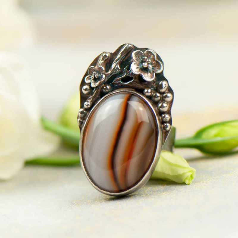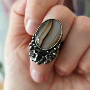 Efektowny pierścionek z prążkowanym agatem został wykonany ręcznie ze srebra próby 925. Owalny agat otoczony jest kwiatuszkami wykonanymi techniką metaloplastyki, co nadaje mu romantycznego charakteru. Srebro było miejscowo oksydowane i przecierane w celu uzyskania unikatowego odcienia. Będą idealnym dodatkiem do eleganckich stylizacji, jak i trafionym prezentem dla osób gustujących w wyrazistej biżuterii.