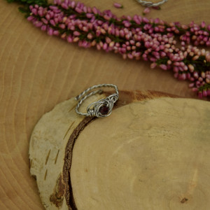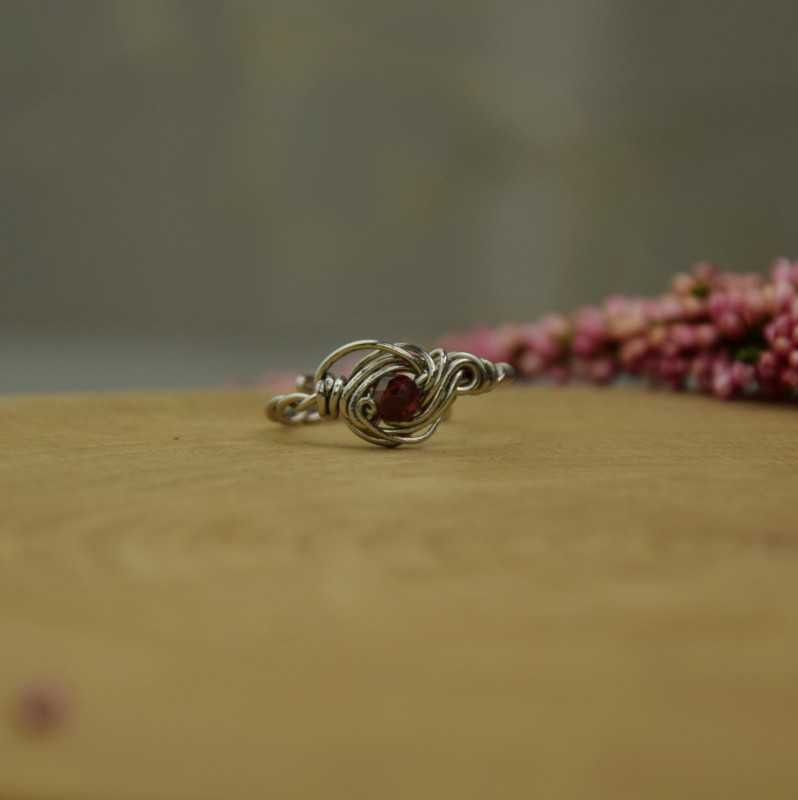 Subtelny pierścionek z granatem, wykonany w całości ręcznie techniką wire wrapping. Pierścionek wykonałam z drutów ze stali chirurgicznej. Rozmiar regulowany - można go samodzielnie wyregulować palcami -rozszerzając lub dociskając.