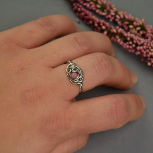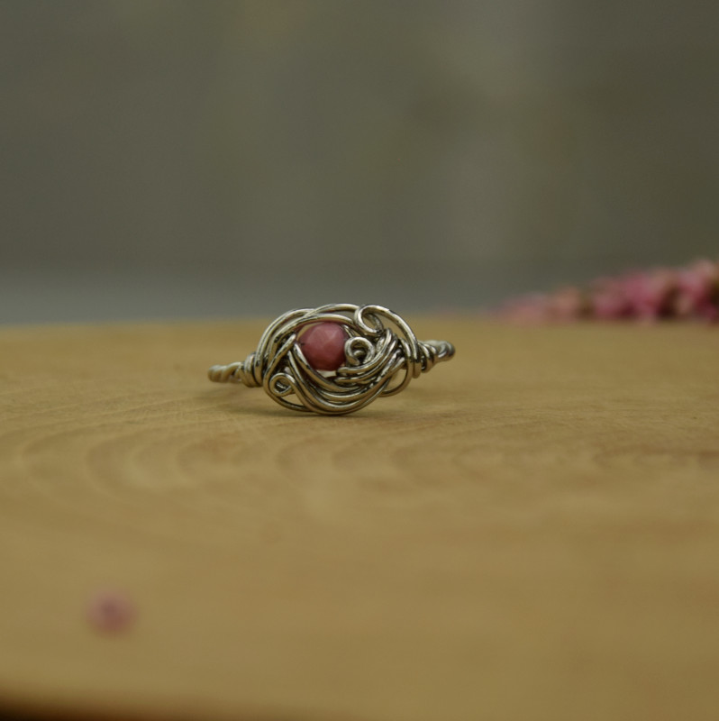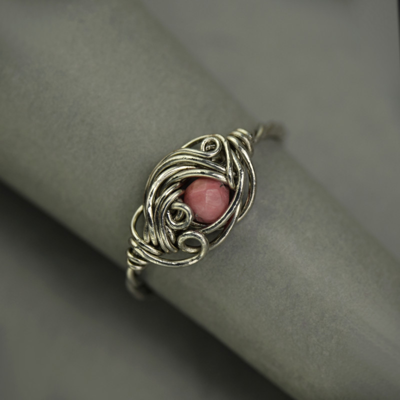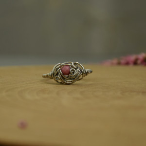 Delikatny, ale efektowny pierścionek z rodonitem, robiony ręcznie techniką wire wrapping z drutów ze stali chirurgicznej. Rozmiar regulowany - można go samodzielnie dopasować dociskając lub rozszerzając palcami.