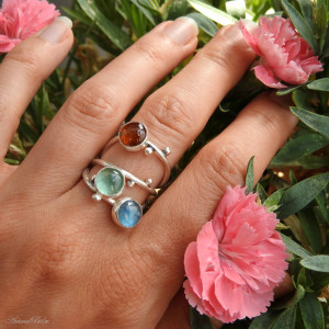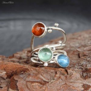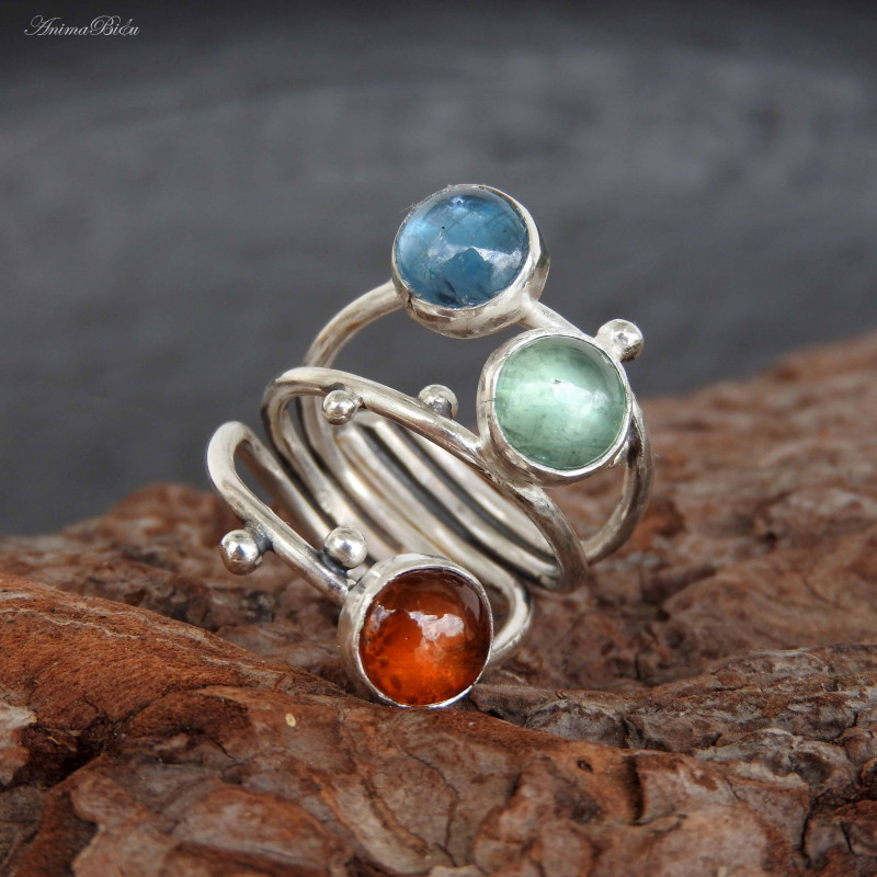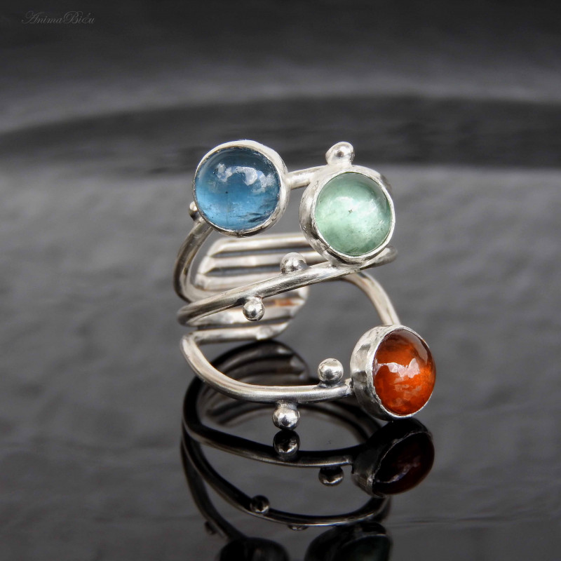 Pierścionek srebrny z kyanitami. Trzy urocze, landrynkowe kyanity w słodkich kolorach pastelowej zieleni, błękitu i soczystej pomarańczy oprawiłam ręcznie w srebro próby 925, które wypolerowałam na połysk. Trzy korony osadziłam na potrójnej obrączce, na której umieściłam jeszcze kilka srebrnych kuleczek. Rozmiar pierścionka jest regulowany, na zdjęciach ustawiony na 13. Przy zakupie proszę o podanie rozmiaru jaki mam ustawić. Waga pierścionka: 6,4g. Kamienie mają 7mm średnicy. Technika wykonania: lutowanie, młotkowanie.