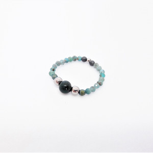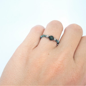 Elegancki, pełen uroku pierścionek elastyczny wykonany z apatytu, hematytów i agatu.