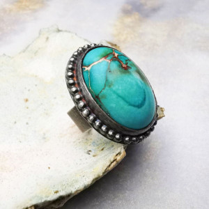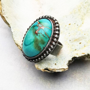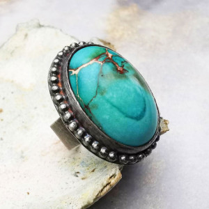 Pierścionek z jaspisem, którego głównym elementem jest błękitno-turkusowy jaspis cesarski, to efekt wyjątkowego połączenia srebra i kamienia naturalnego. Swoją barwą przywodzi na myśl lazurowe wybrzeże i turkus morskich fal. Pierścionek został stworzony ręcznie oraz zaprojektowany ze szczególną uwagą tak, aby cieszył oko nawet najbardziej wymagającej amatorki biżuterii.